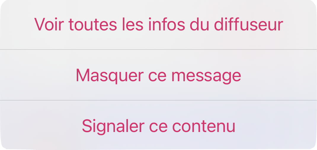 Masquer un message revient à le supprimer de la vue du fil d’informations. Le message reste néanmoins toujours visible dans la liste des messages sur la page du diffuseur.
