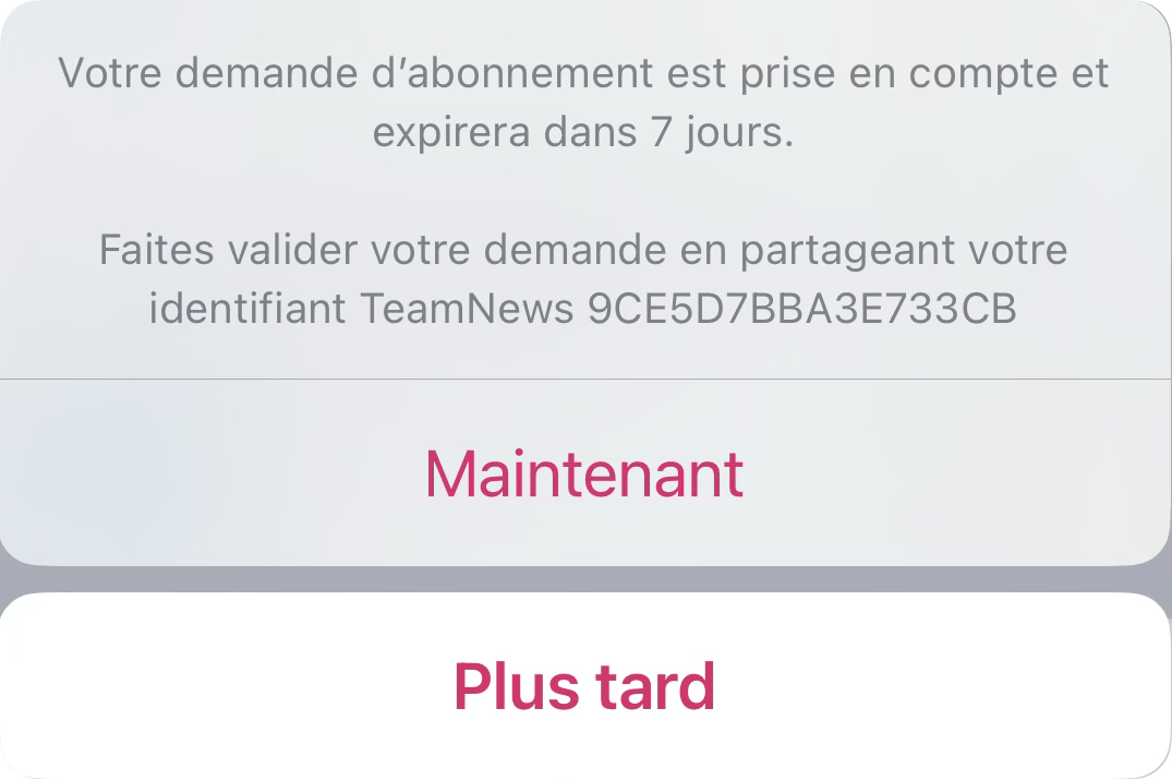Un message vous invite à partager votre identifiant teamnews pour permettre au diffuseur de valider votre abonnement.