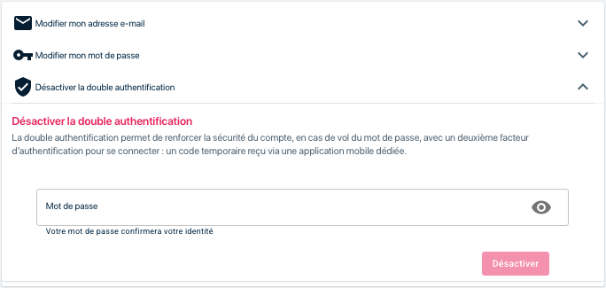 Si vous avez un profil « Administrateur » vous pouvez désactiver la double authentification pour vous-même :