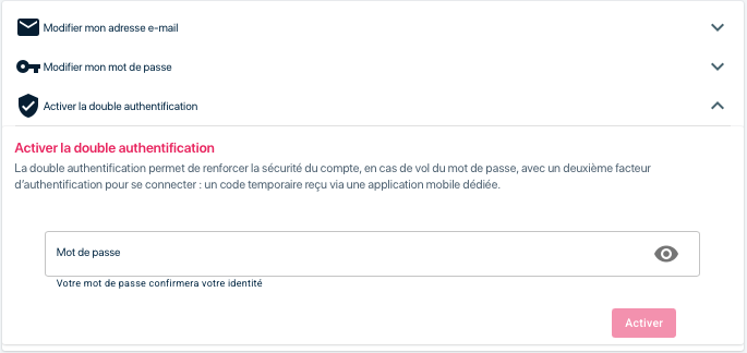 Seul un profil « Administrateur » peut activer la double authentification pour lui-même et pour les autres utilisateurs du compte : même compte, mêmes canaux de diffusion que lui-même.
