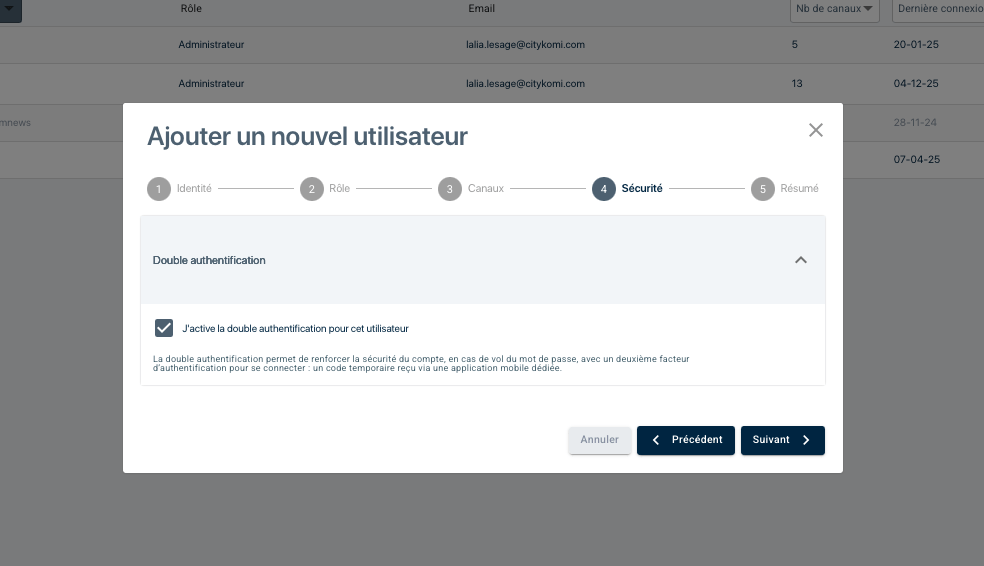 4. A l’étape Sécurité, cochez la case « J’active la double authentification pour cet utilisateur« .
