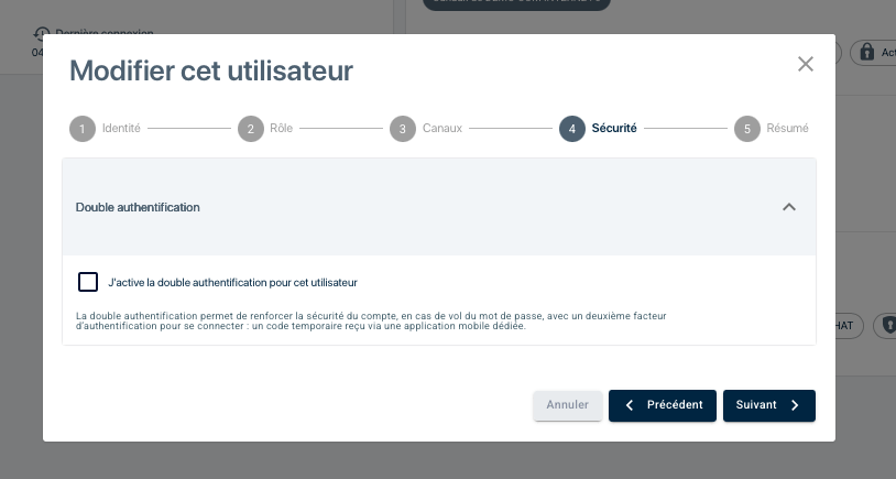 L’option « Activer la double authentification » pour un autre utilisateur que vous-même est accessible à la création ou la modification d’un utilisateur dans le menu « Mes Utilisateurs«