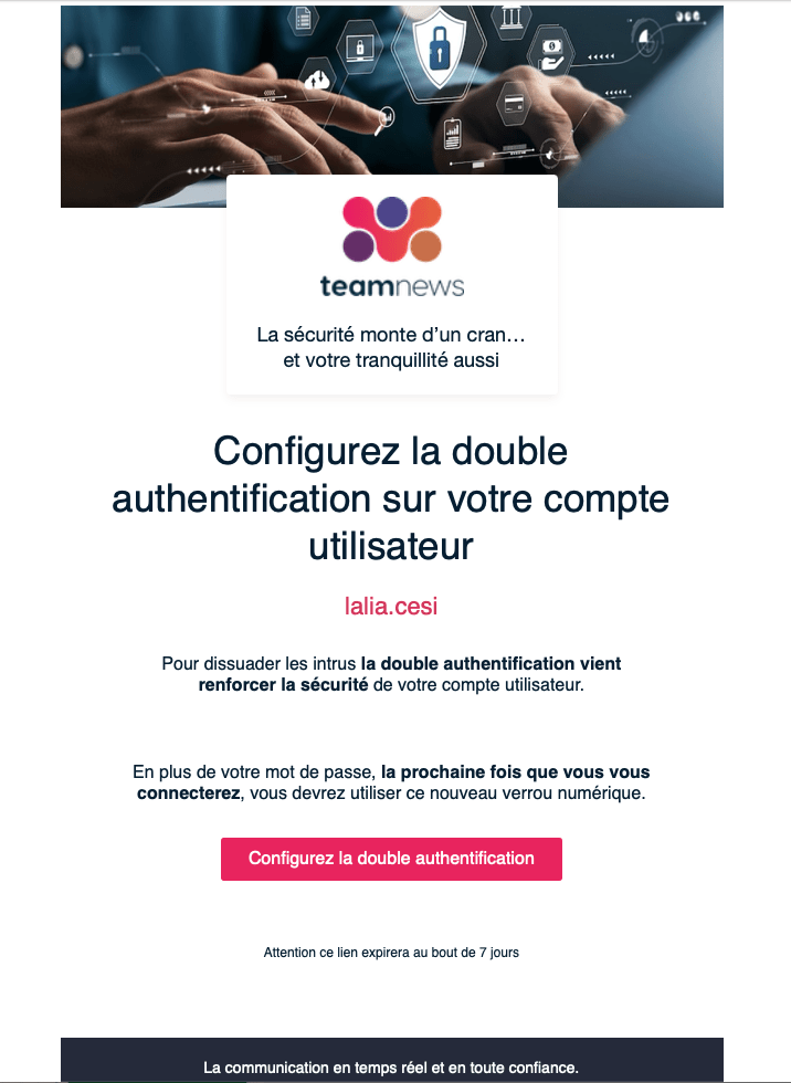 Dès que la double authentification est activée sur votre profil, vous recevez aussitôt un e-mail vous invitant à configurer la double authentifcation à la prochaine connexion à votre compte.
